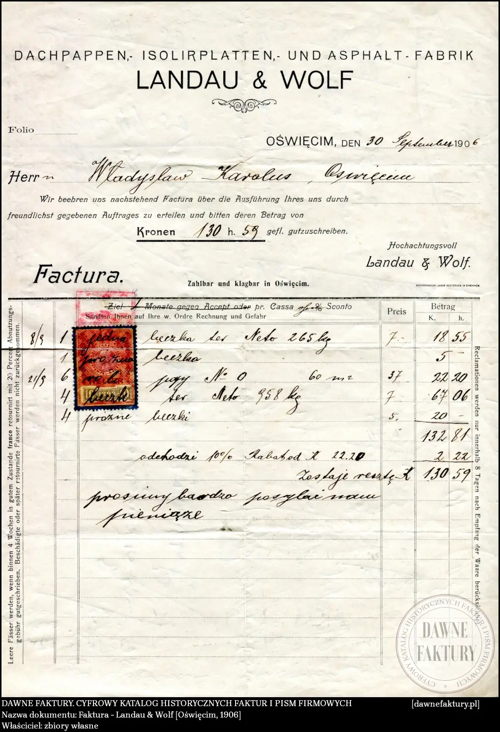 Landau & Wolf – Fabryka Papy Dachowej i Produktów Asfaltowych [Babice, k. Oświęcimia]