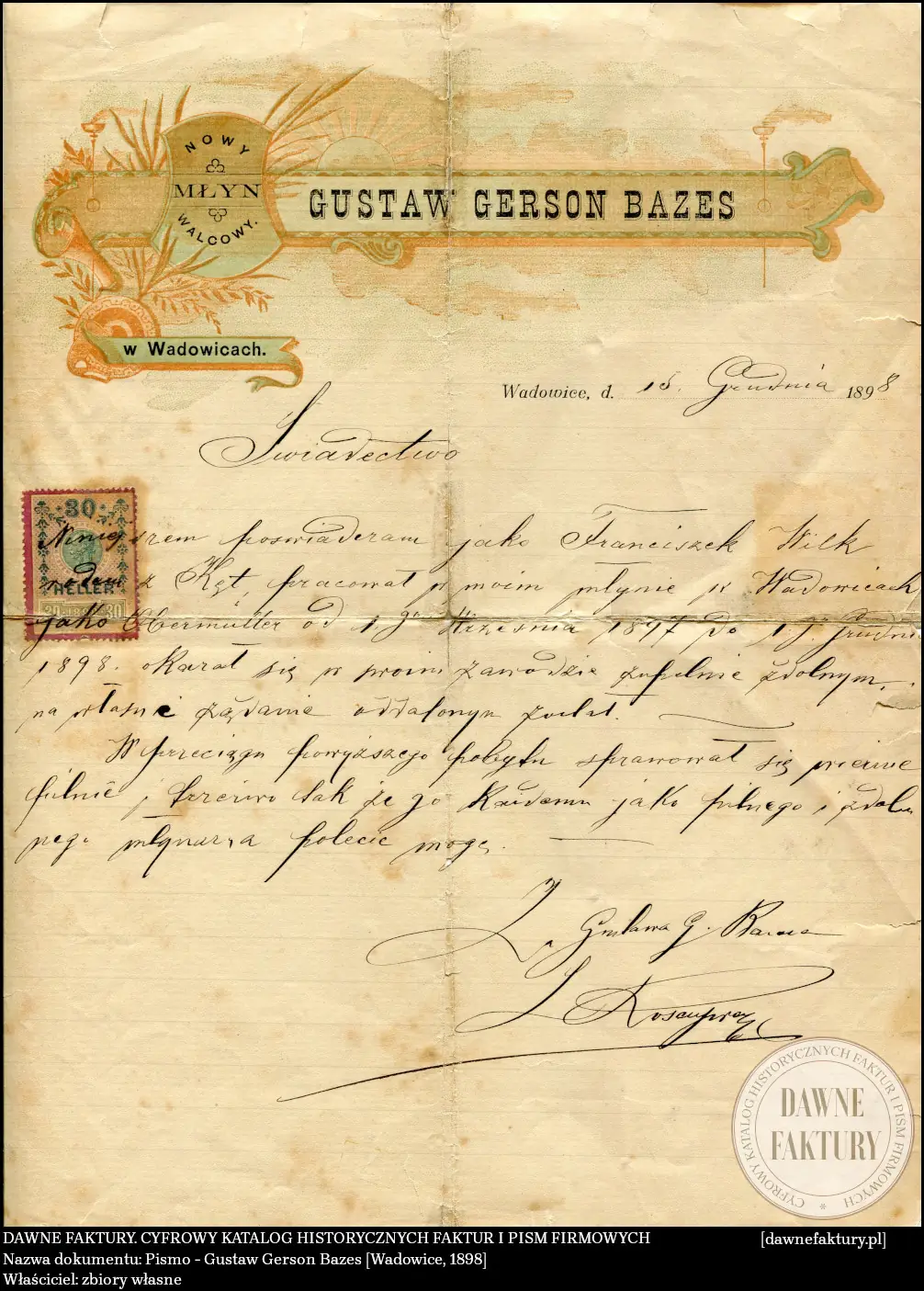 Franciszek Wilk, dla którego wystawiono referencje, zanim zatrudnił się w młynie Gustawa Bazesa w Wadowicach, pracował w młynie parowym Neumanna w Białej (LINK).