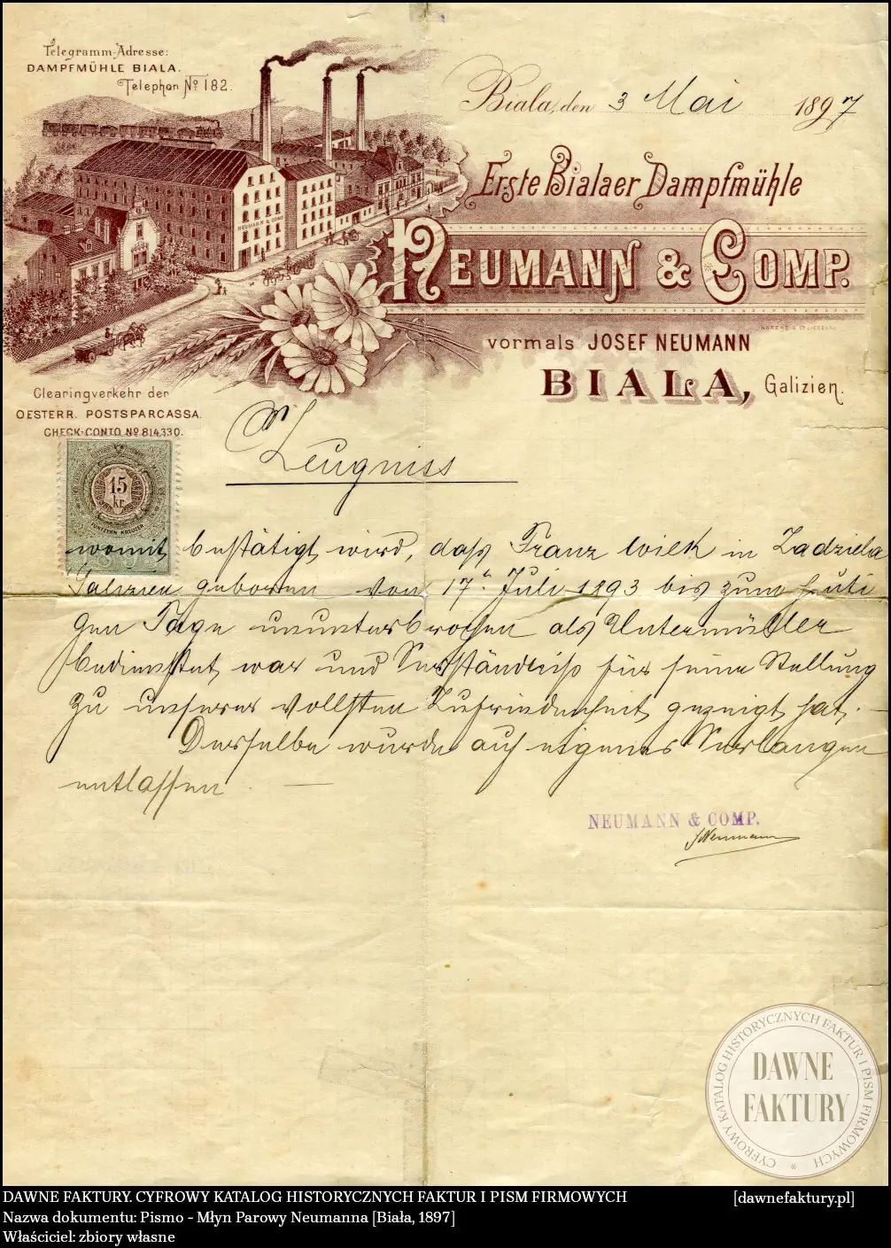 Pismo – Młyn Parowy Neumanna [Biała, 1897]