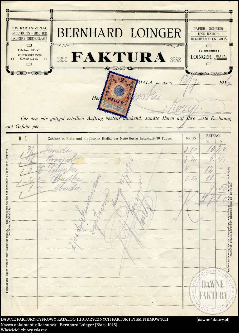 Rachunek – Bernhard Loinger [Biała, 1916]