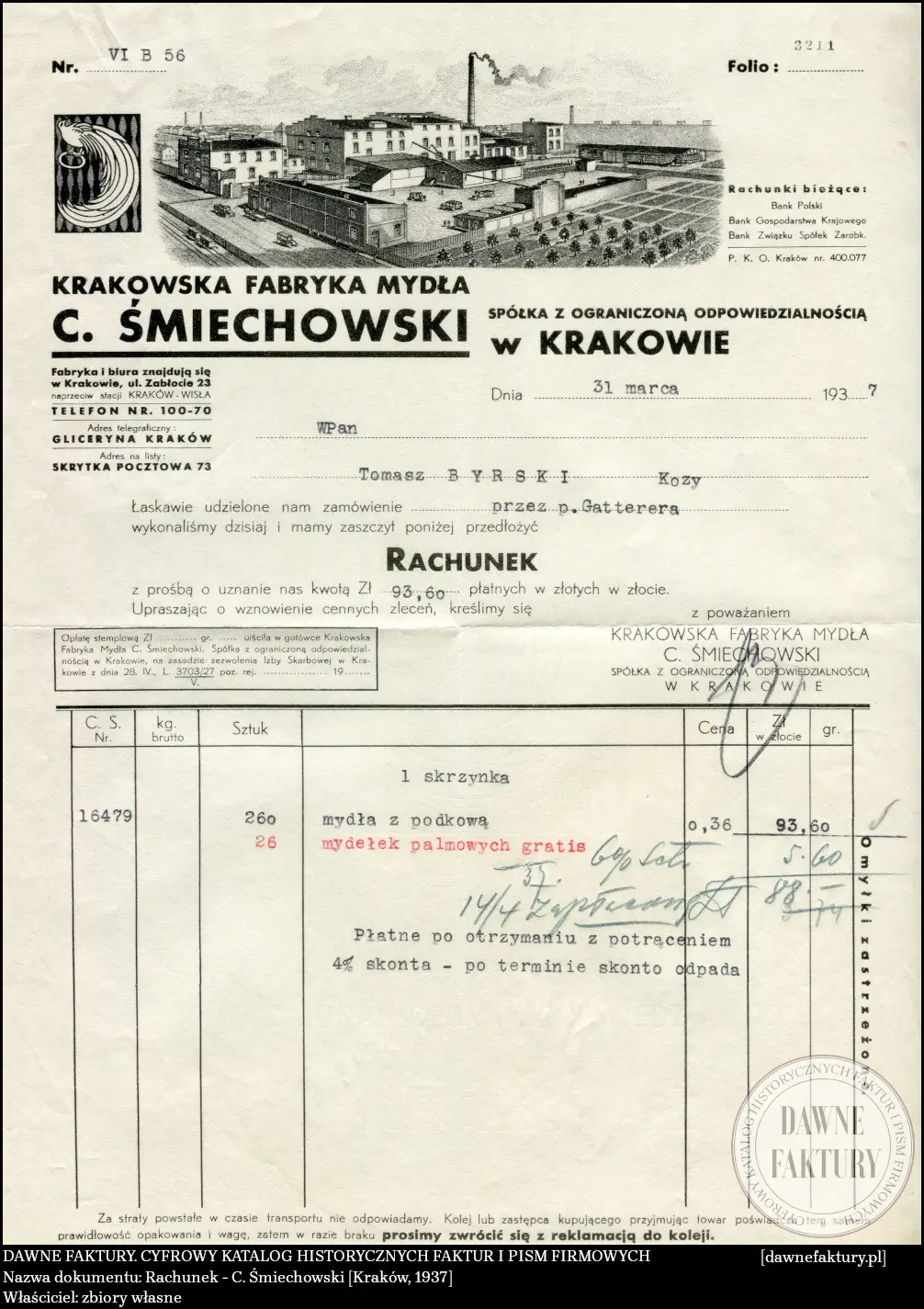 Rachunek – C. Śmiechowski [Kraków, 1937]