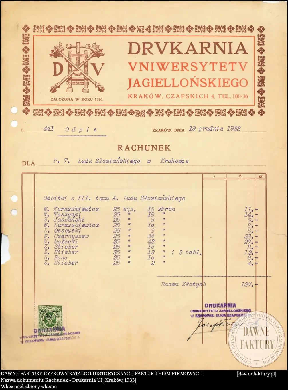 Rachunek – Drukarnia UJ [Kraków, 1933]