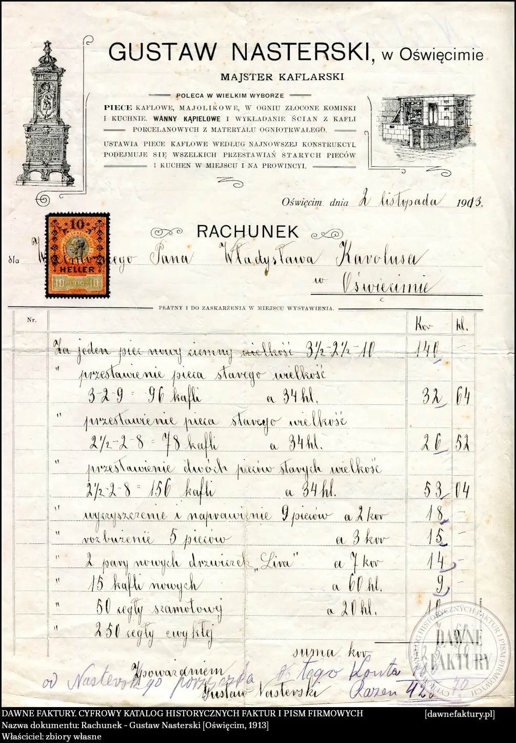Rachunek – Gustaw Nasterski [Oświęcim, 1913]