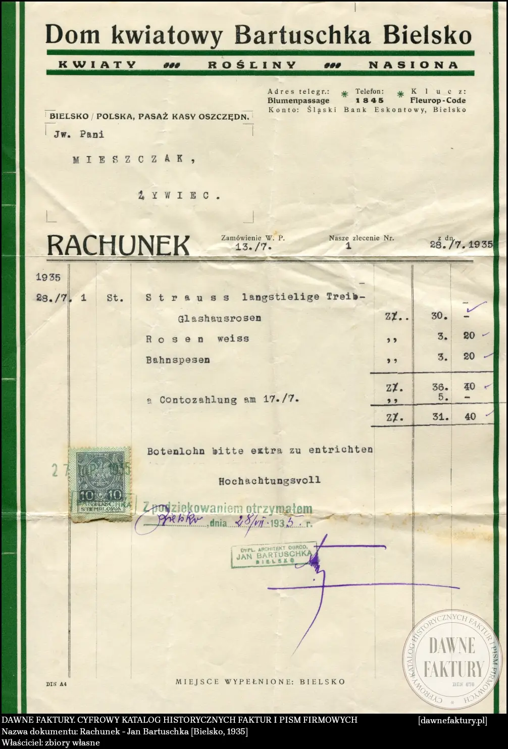 Rachunek – Jan Bartuschka [Bielsko, 1935]