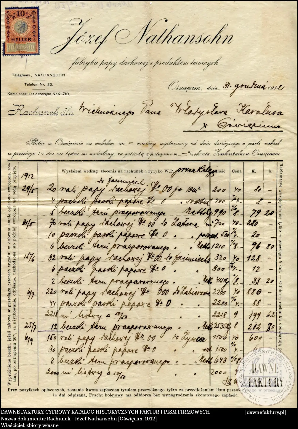 Józef Nathansohn – Fabryka Papy Dachowej i Produktów Terowych [Brzezinka, k. Oświęcimia]