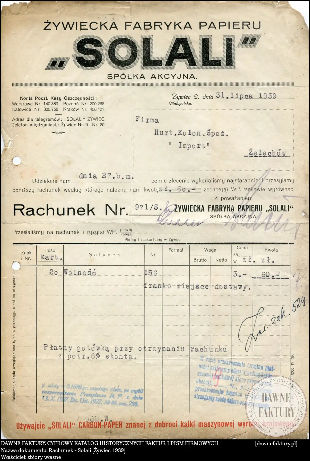 Rachunek – Solali [Żywiec, 1939]