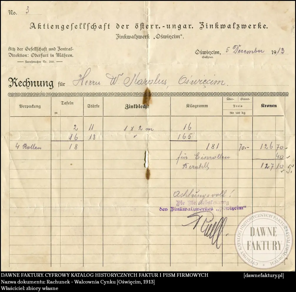 Rachunek – Walcownia Cynku [Oświęcim, 1913]