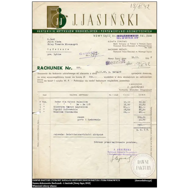 Rachunek – J. Jasiński [Nowy Sącz, 1942]