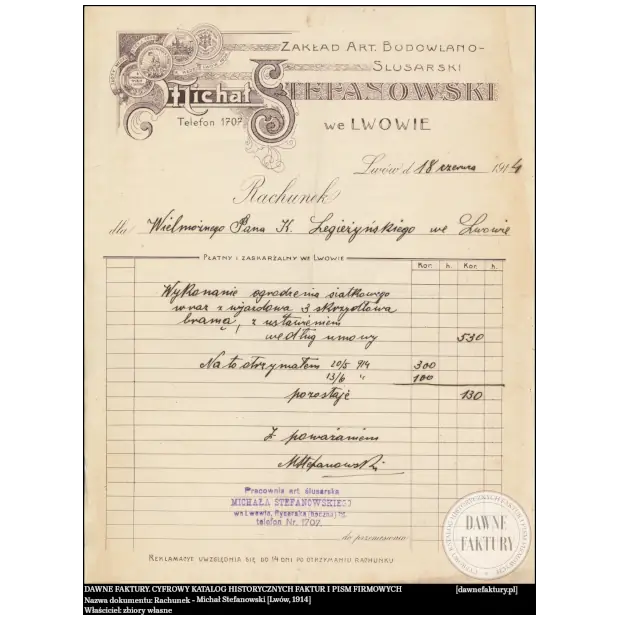 Rachunek – Michał Stefanowski [Lwów, 1914]