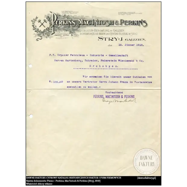 Pismo – Perkins, Mac’Intosh & Perkins [Stryj, 1910]