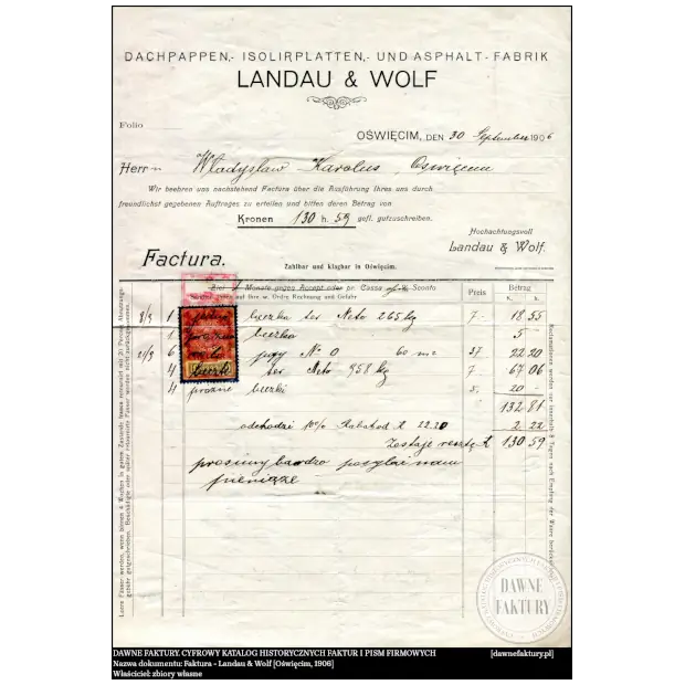 Faktura – Landau & Wolf [Oświęcim, 1906]