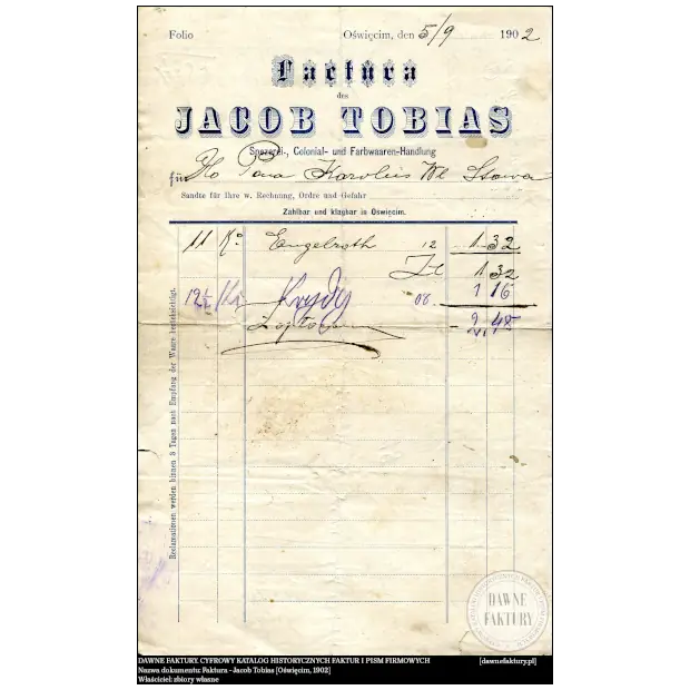 Faktura – Jacob Tobias [Oświęcim, 1902]