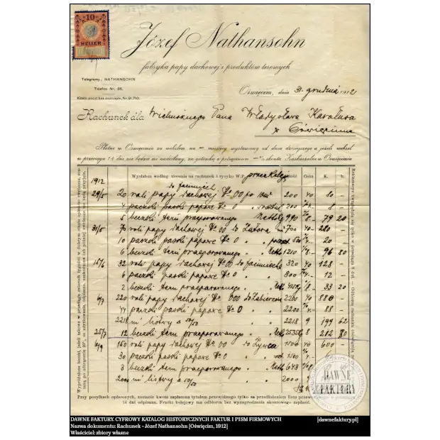 Rachunek – Józef Nathansohn [Oświęcim, 1912]