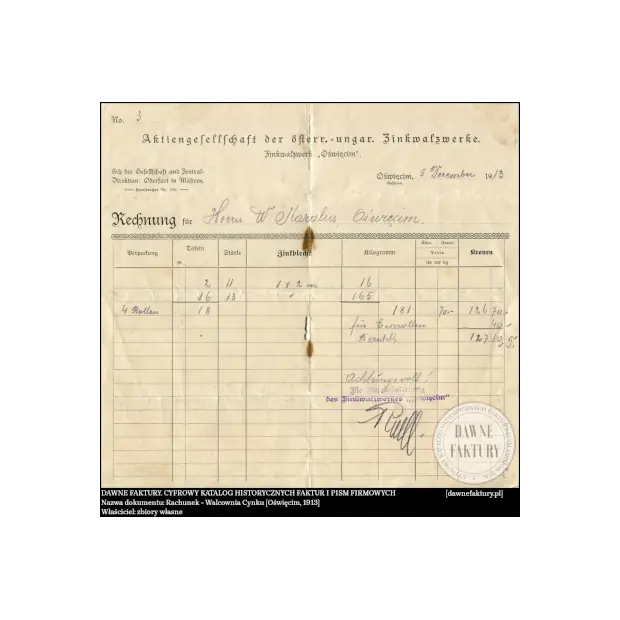 Rachunek – Walcownia Cynku [Oświęcim, 1913]